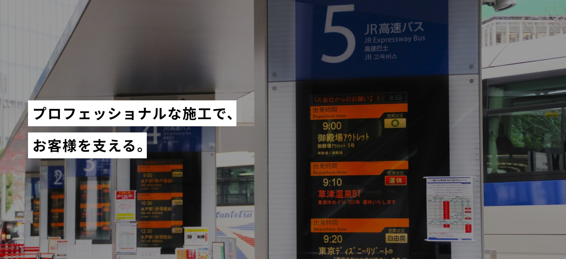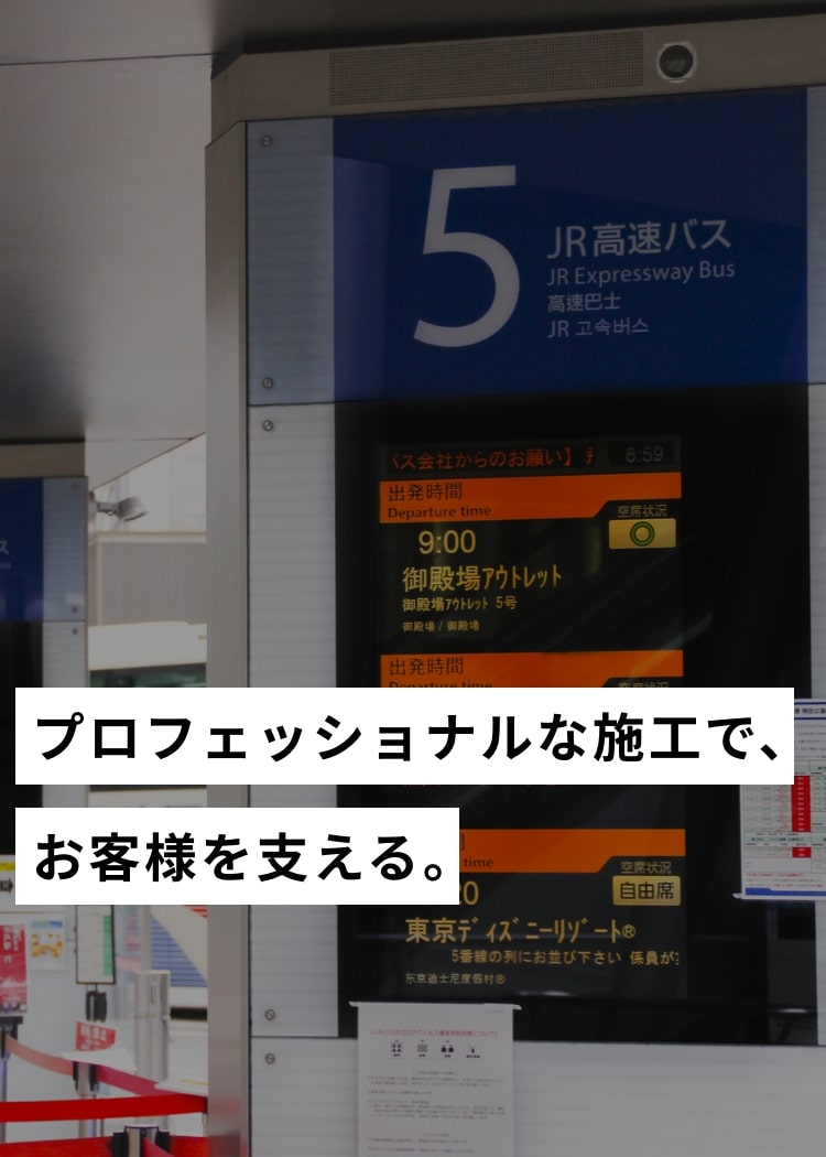 AIR CONDITIONER エアコン工事 豊富な経験と確かな技術力に基づき、幅広い現場で高品質な工事を実施しています。一般住宅から商業施設やオフィスビルまで、お客様のニーズに合わせた最適な空調環境を実現します。お客様の快適さと満足度を最優先に考え、親切かつ迅速な対応を心がけています。信頼できるパートナーとして、理想の空間づくりをお手伝いします。 詳細を見る 施工事例をみる DIGITAL SIGNAGE デジタルサイネージ施工 商業施設や公共スペースなど、さまざまな場所での展示や広告において、お客様のブランドやメッセージを効果的に伝えるソリューションを提供します。高品質な設備とスキルを持つプロフェッショナルチームが、お客様のニーズを的確に捉え、クリエイティブなサイネージの実現に全力を注ぎます。 詳細を見る 施工事例をみる